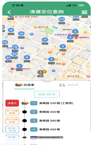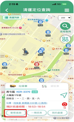環保局說明,此次APP全新改版,讓市民查詢垃圾清運資訊更加即時、便利。其中「動態清運查詢」功能如同公車預計到站資訊,市民可針對指定清運路線及車輛,即時查詢清運進度與到站點位,有別於傳統單一站點資訊,整條路線的點位與車輛動態均可即時顯示,並依實際清運狀況更新抵達時間功能,結合車輛 GPS 即時更新機制,市民可即時掌握指定路線及車輛清運進度,了解清潔車抵達各點位的最新預估時間,避免久候情形。