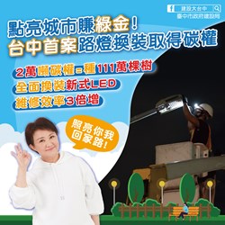 台中市推動城市永續發展再寫新頁!台中市政府建設局推動「路燈光亮計畫」,將舊式高耗能鈉光燈全面汰換為LED節能燈具,日前經環境部審議通過,成功註冊為台中市首案將路燈節能成效轉化為「碳權」的自願減量專案,不僅提升夜間照明品質與通行安全,更將節省電力轉化為可量化的「綠色資產」,展現市府落實淨零轉型的具體行動。